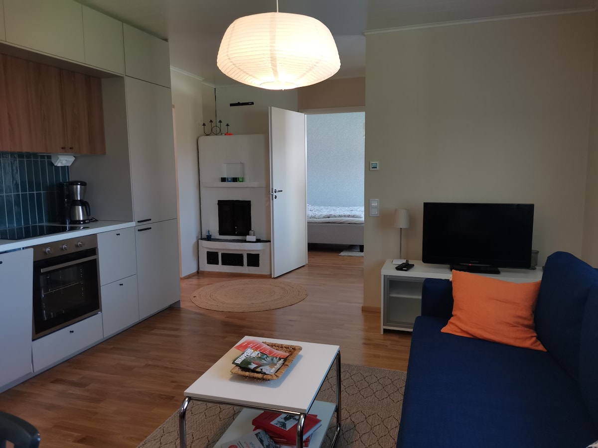 Pond, clean water, sand bottom, amazing Finnish sauna. There is a queen size bed and a sofa which fits two people. There is a seperate entrance to the sauna, which has a shower and bathtub. The sauna is used also by us. We have deer that are kept in a fenced in area.
