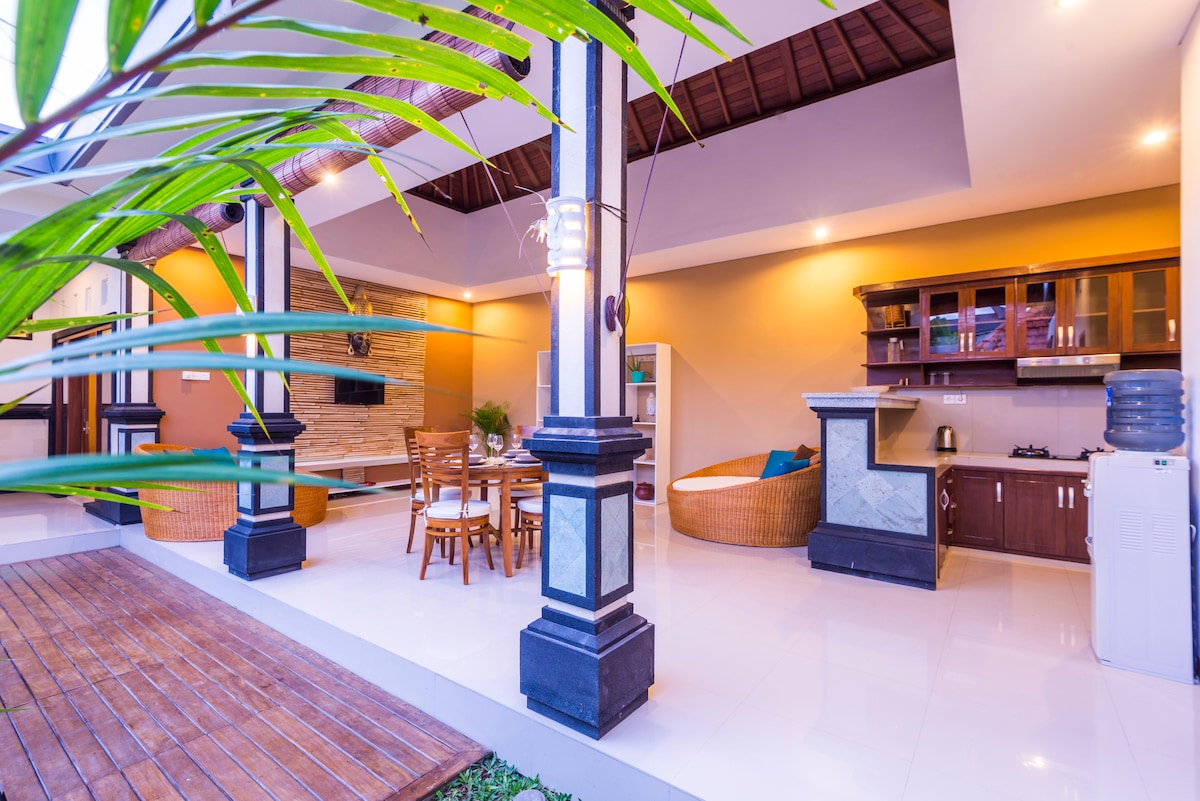 * TOP AREA * FLOODS SAFE villa * open living room concept with ceiling fan * 2BR villa with AC * 900m from Batu Belig beach * 50m from Nourish cafe * WIFI up to 100 Mbps * Villa area without barking dogs and roosters * private 5m pool * Netflix Premium * European style market POPULAR, 250m, 3 min walking * secure ATM with 24 hours of security * 100m Prime plus medical clinic open 24 hours * Fully equipped kitchen * Cleaning service 6 days/week * Parking for one car