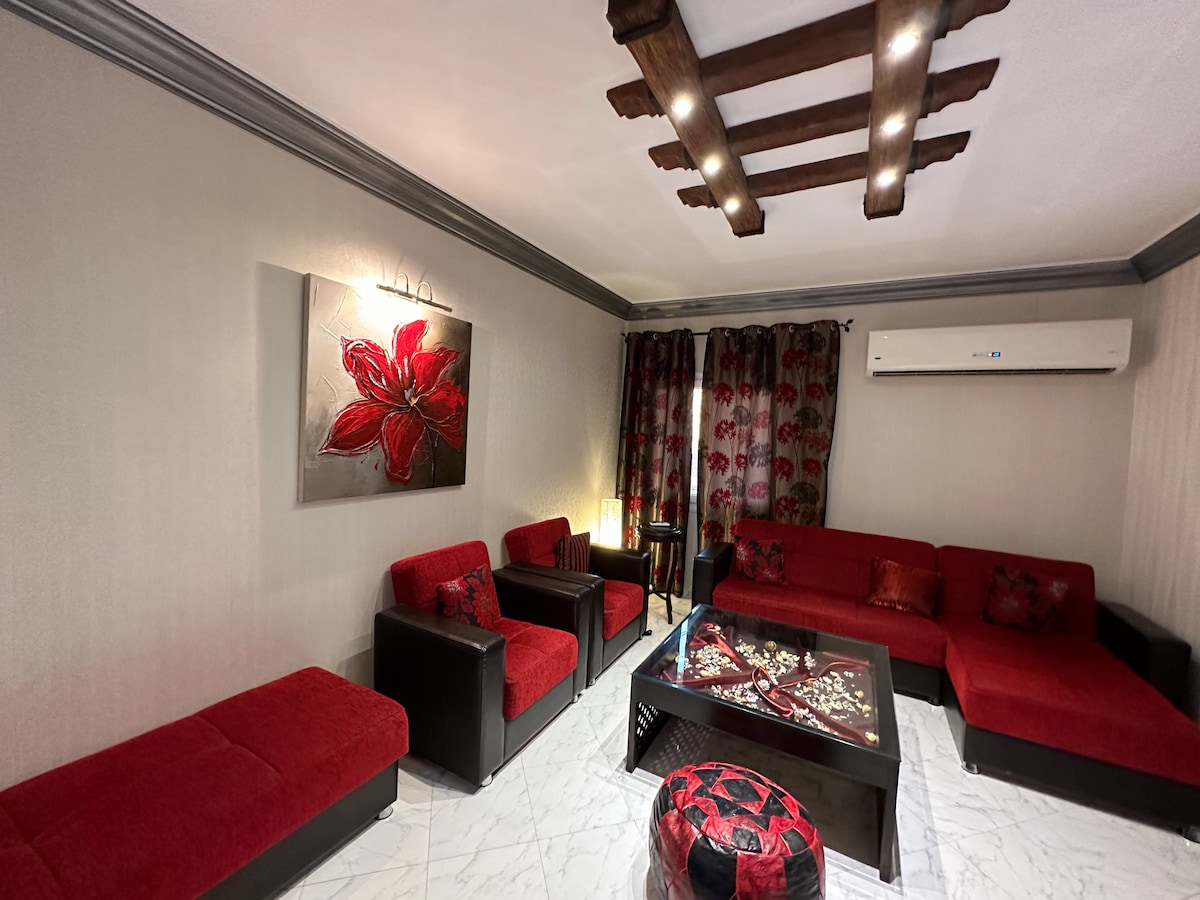 Yenicə təmir edilmiş 1 otaqlı birinci mərtəbə mənzil yaşıllığı olan kiçik rahat örtüklü birləşmədədir. Bu, kiçik ailə və ya işgüzar səyahətçilər üçün qonaqlamanızı mümkün qədər rahat etmək üçün tam təchiz olunub. Böyük ticarət mərkəzləri və biznes parklarından ibarət kolleksiyanın yaxınlığında. Mürəkkəbin 24/7 təhlükəsizlik və təhlükəsiz qapıları və mürəkkəbin ətrafında tonlarla rahat mağaza var. Giza Piramidalarından cəmi 25 dəqiqə, Ağıllı Kənddən 15 dəqiqə və Böyük Misir Muzeyinə 20 dəqiqə.
