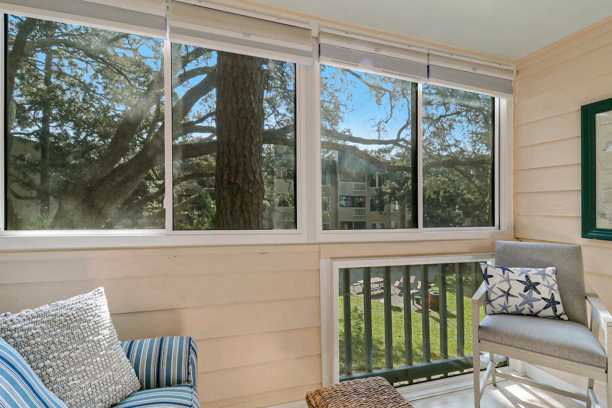 Warm, modern, and designed with character—this newly remodeled 2-bed/2-bath is the closest condo to Hilton Head's hidden gem beach, with lagoon and sound views. King bed in the primary, twin beds in the kids' room: screened-in sunroom, 3 pools, hot tub, tennis. Fully stocked kitchen with a guest-favorite coffee bar, restocked fresh each stay. In-unit laundry, big-screen TVs in every room, all the beach gear you need (cart, chairs, boards, toys, and more), 400 MB Internet—no cleaning fee!