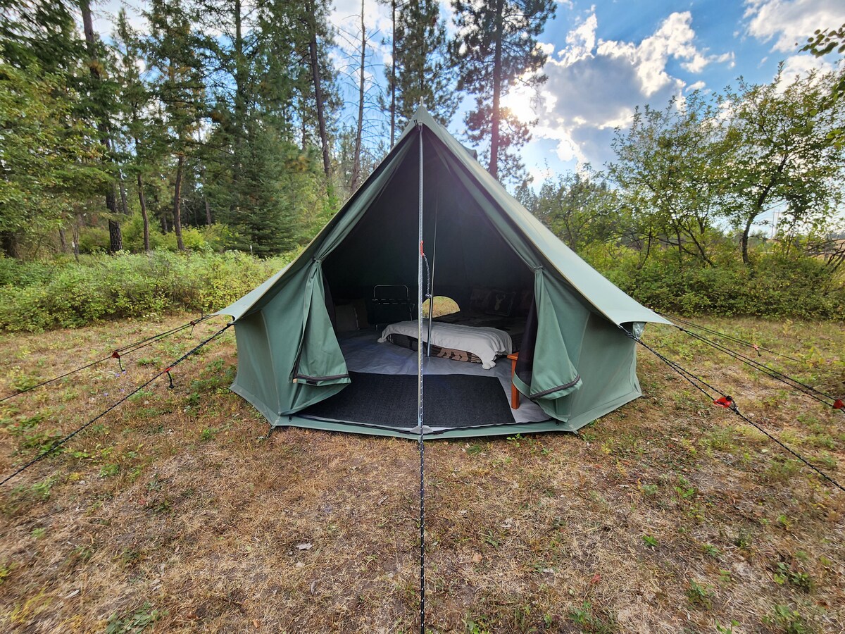 Şam ağaclarında yerləşən 9 unikal düşərgəmiz dincdir, lakin kiçik Kolumbiya şəhərinin kovienensiyasından cəmi 3 mil məsafədədir və Buzlaq parkının girişinə cəmi 15 dəqiqəlik məsafədədir. Bu alaçıq çadırı duş binasına ən yaxın məsafədə qurulub və içəridə elektrik enerjisi, eləcə də köpük yastıqları olan iki kotan var. Yataq çantalarınızı gətirin və ya ikimizdən istifadə edin (yastıqlar daxil olmaqla). Həmçinin qonaqlamanız zamanı istifadə üçün mövcud olan ayı spreyimiz (10 dollarlıq icarə) və hər biri 4 və ya 3 dollardan 10 dollara odadavamlı paketlərimiz var.