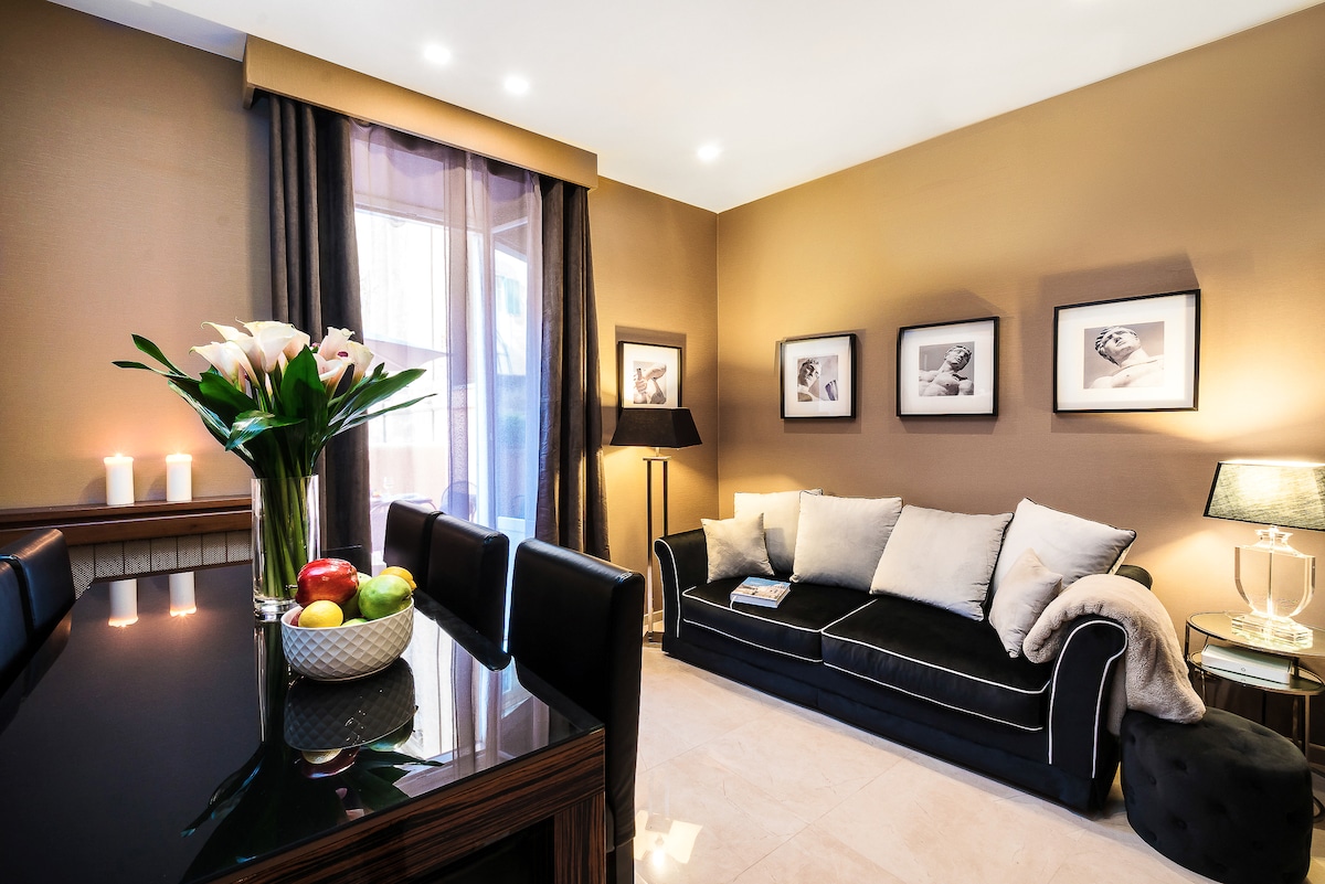 Dünyanın ən məşhur meydanlarından biri ilə üzbəüz tarixi binada yerləşən bu bir otaqlı mənzil birinci mərtəbədə yerləşir və müasir imkanlara və açıq havada şam yeməkləri üçün mükəmməl enli verandaya malikdir. Cütlüklər və ya kiçik ailələr üçün ideal olan mənzildə bütün otaqlarda yüksək səviyyəli A/C sistemi, çoxotaqlı simsiz səs sistemi, buxar hamamı, eləcə də vanna var . Sikkənizi atmaq və şəhərin mərkəzinin canlı atmosferinə qərq olmaq üçün ön qapıdan bayıra çıxın.