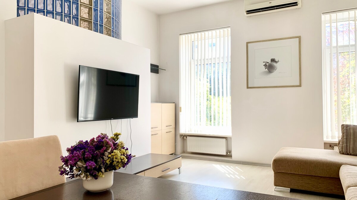 A stylish apartment in the center, designed in Scandinavian style with vintage furniture and modern art. It is located a 15-minute walk from the beach and 10 minutes from the central park, surrounded by many restaurants and bars. A pre-revolutionary building with a cozy Odessa courtyard. The apartment features a separate bedroom with a double bed and a comfortable sofa bed in the living room. The apartment is fully equipped with everything you need.