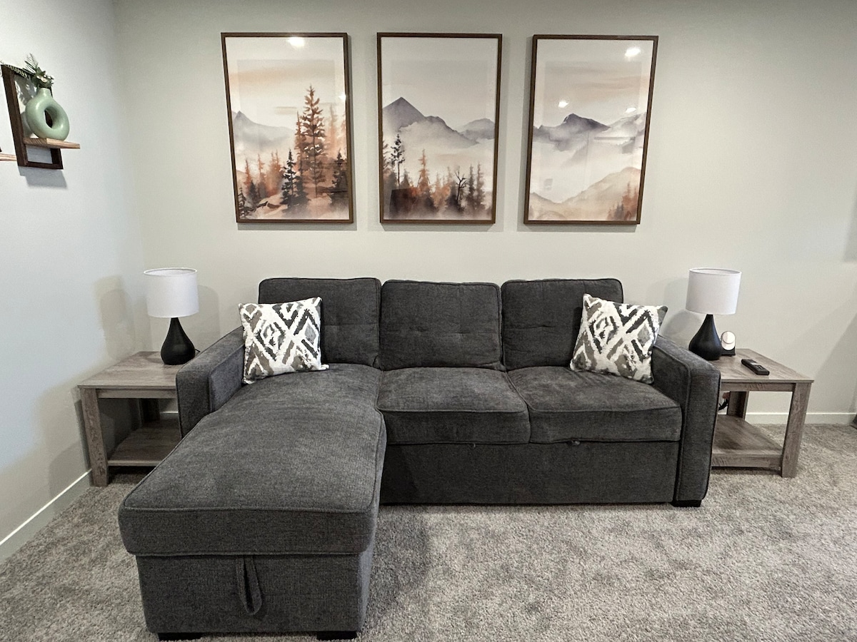 Elegant 2BR Walkout Basement is a private, meticulously curated retreat offering refined comfort and quiet luxury.Enjoy warm evenings by the fireplace and abundant natural light from large windows.This spacious two-bedroom suite features a queen and a double bed ideal for guests who value privacy,cleanliness and an elevated standard of comfort. Direct backyard access and dedicated driveway parking are included.Steps from the Bow River pathways, Sobeys,Seton YMCA and South Health Campus Hospital.