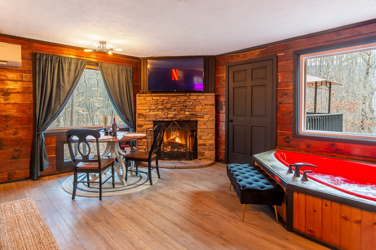Welcome to ❣️Lovers Hideaway❣️—a romantic, aesthetic retreat made for unforgettable moments 🥰 Tucked away in nature, this cozy escape is perfect for honeymoons, anniversaries, or a special just-because getaway. Enjoy intimate movie nights the theater, unwind in the hot tub, or relax by the fire pit under the stars 🍷This ✨one-of-a-kind✨ studio log cabin blends rustic charm with modern comfort, offering peace, privacy, and romance.❣️ 📍25 min Dolly Wood🎢 📍30 min PF🎡 📍40 min Gatlinburg⛰️