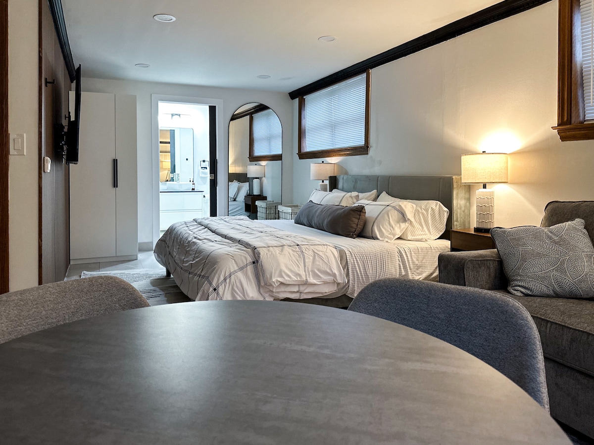 Stay comfortably in this spacious 2-bedroom apartment featuring queen-sized beds in both bedrooms and a sofa bed for extra guests. The kitchenette includes a microwave and coffee/tea maker, ideal for preparing quick meals or snacks. Relax in the living and sitting area, or stay connected with complimentary high-speed Wi-Fi. Perfect for families or groups, this apartment accommodates up to 6 guests, offering modern amenities and a cozy, home-like atmosphere in downtown Detroit.