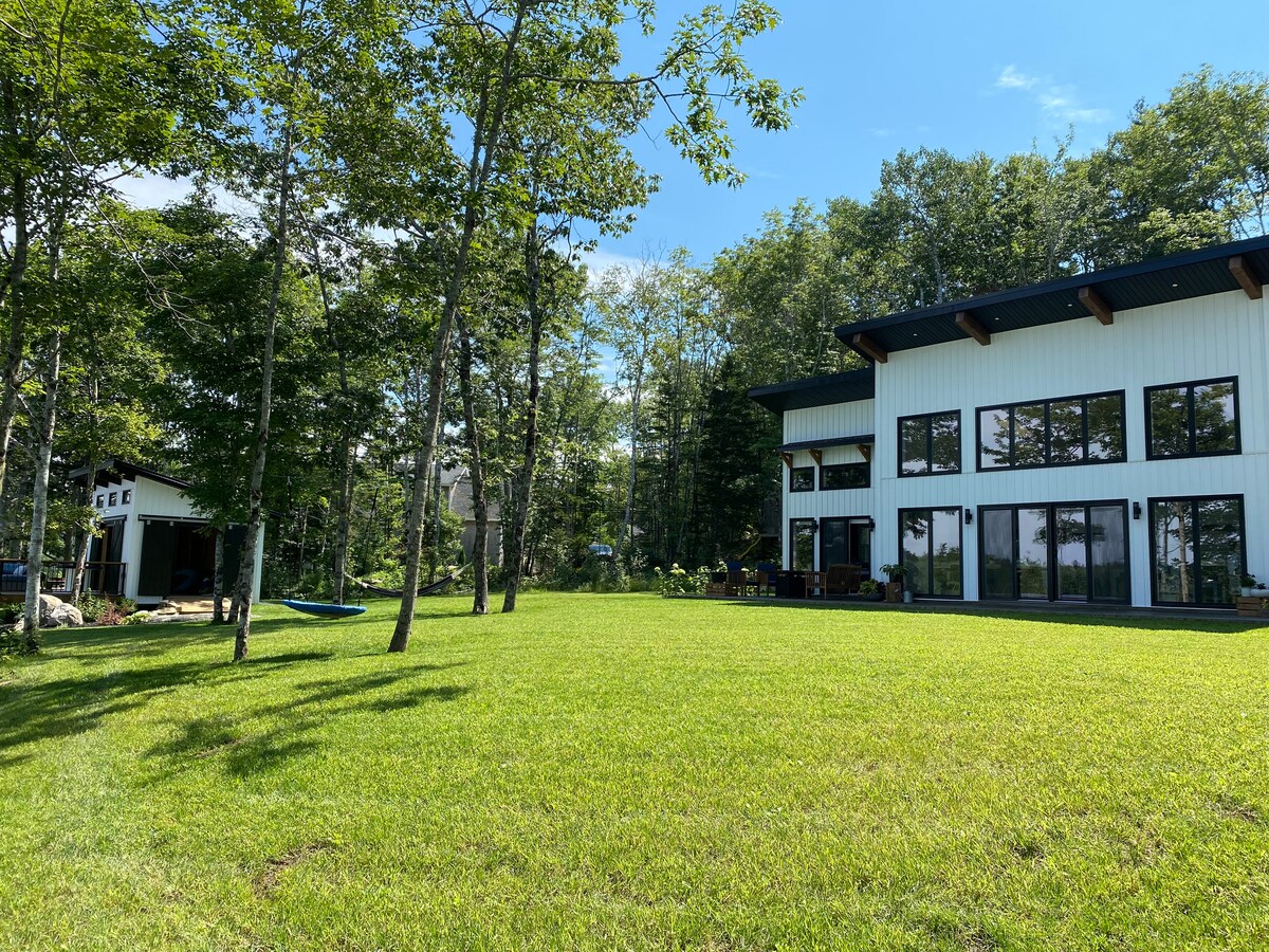 We would like to share this piece of our paradise with you, located on a tranquil, crystal clear lake. Acres of land, a sandy beach hidden behind a well-groomed property sprinkled with beautiful tall trees disappearing into the Acadian forest. Includes: private hot tub and firepit, shared sauna, cold plunge, lake access, public wood fired hot tub (great for groups when booking one than more cabin) canoe, kayaks, paddle boards, pedal boat, sandy beach, floating mat and more.