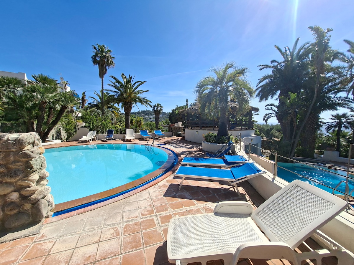 Una piscina termale, una sauna naturale. Una villa esclusiva immersa in un rigoglioso giardino, sospesa tra cielo e mare. Nell'incanto della Baia di Citara una delle più suggestive dell'isola perché esposta interamente ad Ovest: tramonti da sogno col sole rosso che si va spegnendo nel mare aperto dietro l'isola di Ventotene, unico ostacolo allo sguardo spalancato sull'orizzonte immenso. Sei camere da letto doppie, fresche, panoramiche ognuna con suo bagno, ventilatori e mini frigo.