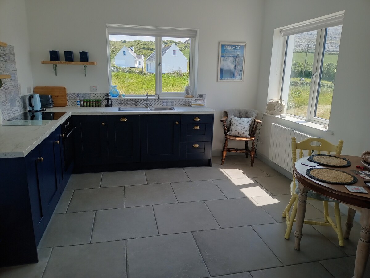 The house is a modern , spacious 2 bedroom property in the heart of the Burren. It has open plan fully equipped kitchen/living room with cooking utensils and some basic provisions provided Tea, Coffee and Cereals. It has two bedrooms and one bathroom upstairs. Amazing location looking over the Knockanes and Mullagh Mór mountains. Ideal location for walkers, hikers and cyclists. Suitable for children of all ages. A place to relax and enjoy the countryside or a starting point for many adventures.