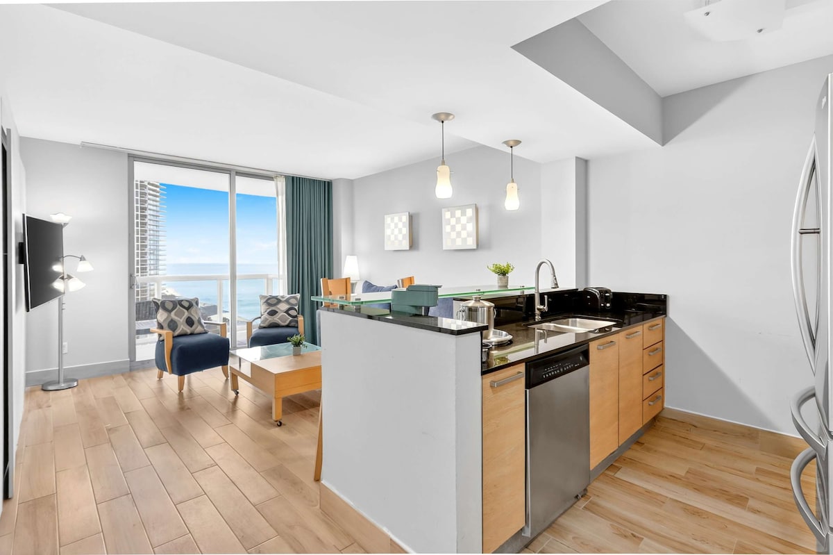 Dənizin gözəl mənzərələri olan, 28-ci mərtəbədə gözəl mənzil!! Mənzildə 2 Suit, 1 çarpayı və 2 Tam Ölçülü Çarpayı var, tam bəzədilib. İnternet, Paltaryuyan maşın və quruducu, qəhvə maşını, mikrodalğalı soba, SubZero Soyuducu qabyuyan maşın və sobamız var. Komfortda dincəlin, 2 Əla Restorandan, 2 Sonsuzluq Hovuzundan, Dənizə gözəl mənzərəsi olan tam təchiz olunmuş idman zalından zövq alın. Çimərlikdə Çimərlik Stulları, Dəsmallar və Çətirimiz var. Ailə və ya Dostlarla dincəlmək üçün mükəmməl yer!!!