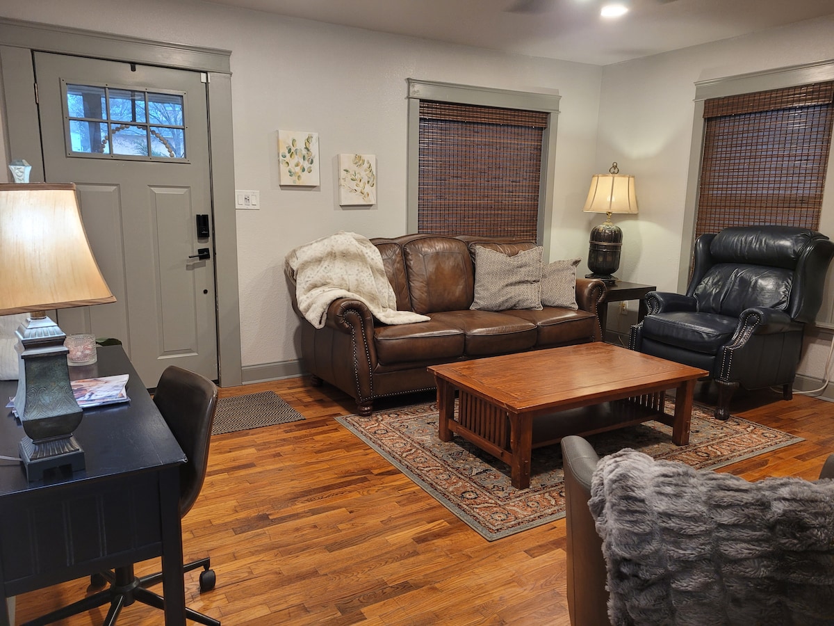 Welcome to The 12th Street Cottage Craftsman — a bright, peaceful retreat nestled in downtown Fort Smith. Just steps from parks, trails, coffee shops, and local eats, this lovingly updated historic home blends cozy charm with thoughtful touches. Whether you're here to shop, work, or just relax, you'll find everything you need to feel at home. Four luxurious queen beds, two modern bathrooms with rainfall showerheads and choice of walk in shower or soaker bathtub.