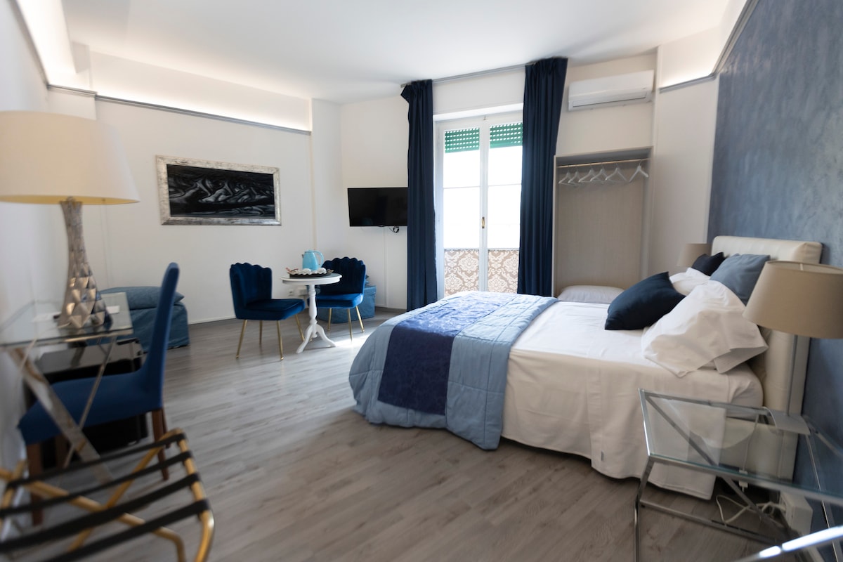 Camera dai colori caldi e avvolgenti, vi ospiterà con stile ed eleganza. Accogliente e funzionale, ha il carattere per non farvi desiderare niente di più. Oltre ai servizi elencati, sono a vostra disposizione un frigorifero, una macchina per caffè espresso e un bollitore per tè e tisane. Letto matrimoniale king-size, a richiesta è possibile avere due letti singoli o una culla per bambini senza costi aggiuntivi.