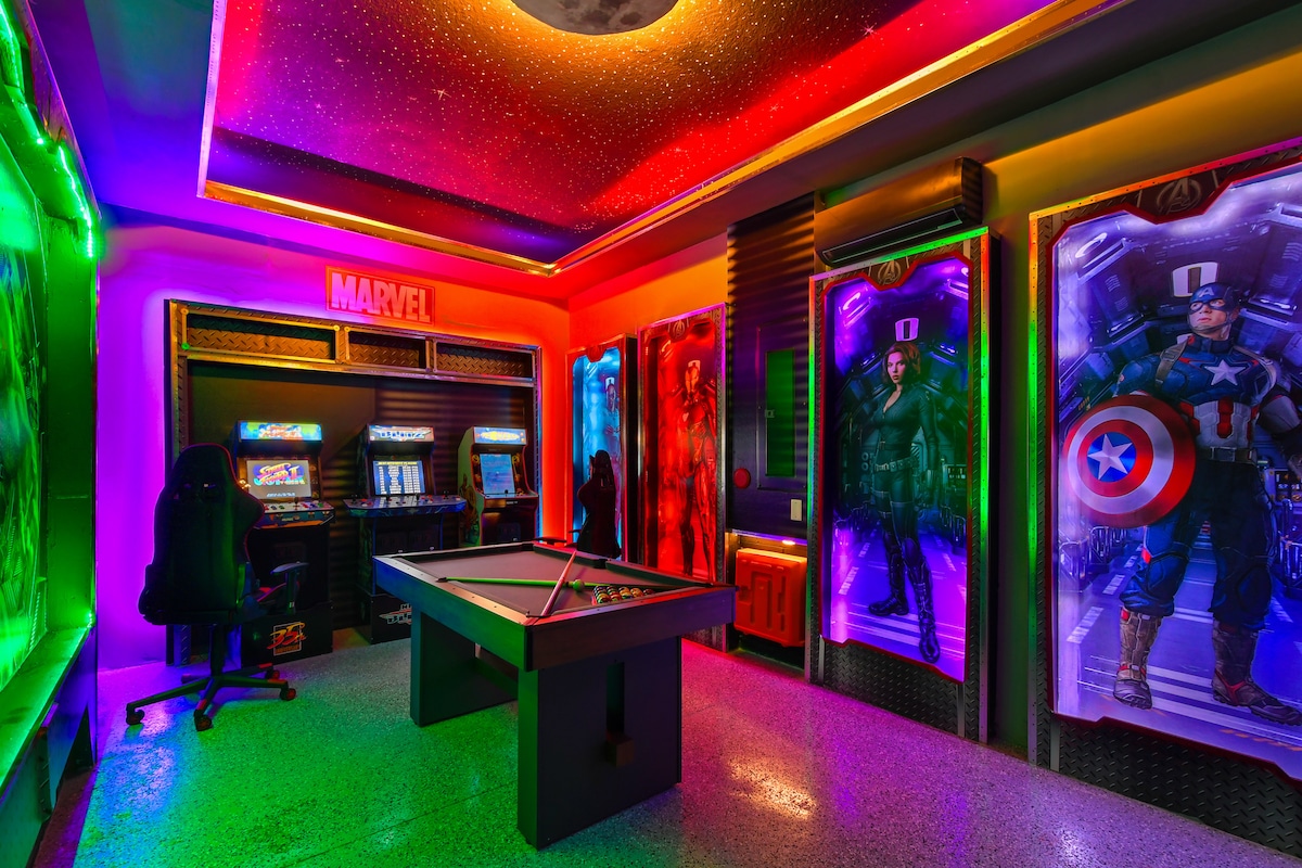 The perfect balance of STYLISH DESIGN, LUXURIOUS COMFORT, & ENDLESS ENTERTAINMENT in the stunning 3.5 square mile Reunion Resort. You will have your own private pool, spa, movie theater - game room, 3 master suites, 3 incredible themed bedrooms (MARVEL, FROZEN II, NASA) for kids or adults, the latest Xbox Series X game station, a 2500 ft2 pool deck overlooking a beautiful forest and pond, fire pit, & billiards table, minutes to Disney.
