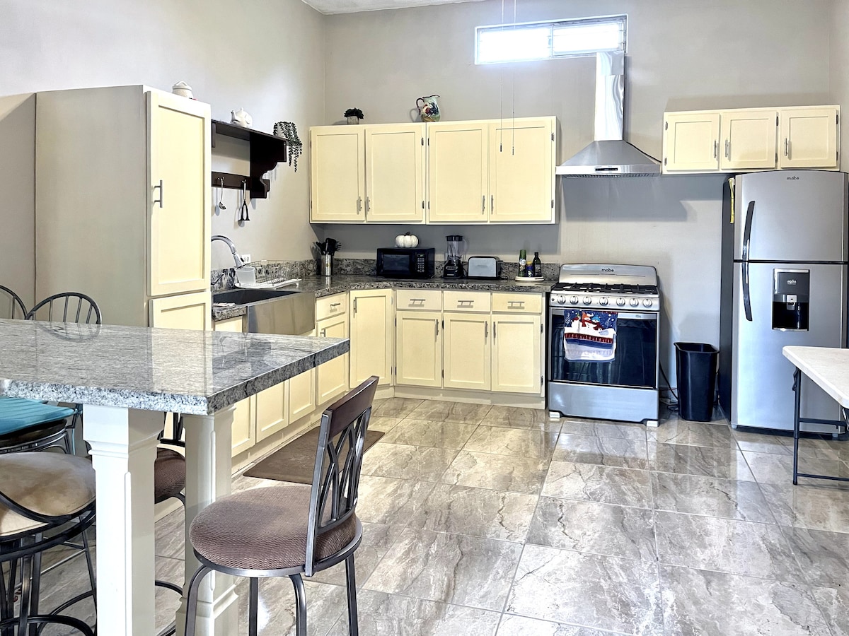 Ailə və ya dostlarınızı toplayın və Monterrey NL-dən avtomobillə cəmi 35 dəqiqə məsafədə yerləşən ərazidəki yeganə isti su hovuzunda 2 və ya daha çox gün dincəlin Üst mərtəbədə loft tipli, qonaq otağı, yemək otağı, mətbəx, hamam, duş və soyuq/isti mini-splitlə təchiz olunmuş 2 king ölçülü çarpayıdan ibarət açıq məkanlı mənzilimiz var. Bura daxildir: Qril Terras Masalar və stullar Günəş çarpayıları Kiddi oyunları Böyük Soyuducu Abanikos Wi-Fi Bütün evdə ambient səs, sadəcə Bluetooth vasitəsilə qoşulun