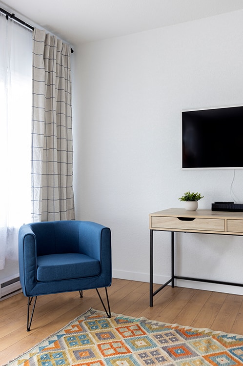 Our completely renovated 1 queen bedroom suites at Kettle Valley Beach Resort are ideal for our guests who want a little more room. We offer a bright sitting area, with a futon (can accommodate 1 adult or 2 small children for sleeping), and a fully equipped kitchen. Each of our suites has a small outdoor sitting area, perfect for a morning coffee or evening beverages. Most suites located on the second floor have a beautiful lake view from their window and outdoor seating area.