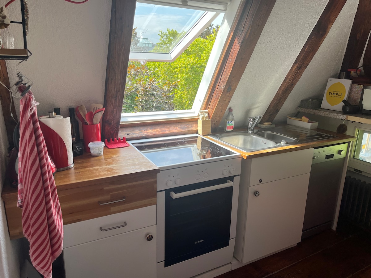 Sadalanan və tamamilə təmir edilmiş Gründerzeit villasında Frayburqun Wiehre rayonunda gözəl, dolama və sevərək təchiz edilmiş çardaq mənzili. Frayburq Kafedralına və Qara Meşəyə baxan geniş dam terrasında səhər yeməyi var. Yataq otaqları qəribə daşlar və tısbağalardır və maili tavanlara görə qapılarla kilidlənə BİLMƏZ.