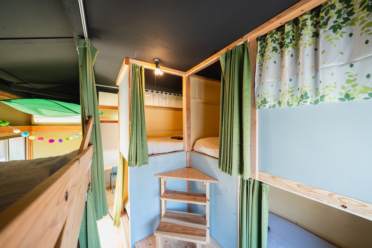 Ümid edirəm ki, nənələrinizin evinə, ayrıca, rim tərəfi və çirki olan böyük 190 m ² qapalı evə qayıtmaq kimi nostalji hissi ilə əhatə olunmuş rahat vaxt ilə əhatə olunaraq yenidən sizə yaxın olan insanların əhəmiyyətini hiss edə bilərsiniz. Bura 10 nəfərə qədər insanı qəbul edə bilər, odur ki, yalnız ailələr və qruplar üçün ayrıca məkandan zövq ala bilərsiniz. Burada 190 m ² bağ da var.Barbekü, uşaqlar və itlər qaçaraq ağıllarını buraxa bilərsiniz. İtiniz qapalı məkanda ola və birlikdə yata bilərsiniz. Uşaqların və itlərin zehni buraxmaq sözlərdən daha çox bədənlərini hərəkət etdirməsi daha əyləncəli olardı, odur ki, qapalı və açıq havada qaçmaqdan çəkinməyin. Dənizə bənzəyən yolda yerləşən mehmanxanadan təxminən 3 dəqiqəlik məsafədədir.Dalğaların və quşların səsini dinləyərkən səhər günəşini seyr etmək yaxşı fikirdir. Otelin yerləşdiyi Buzen Siti meşə terapiyası bazasıdır.Həm qonaqlama, həm də meşə terapiyasında gündəlik həyatın tələskənliyini unutduğunuz üçün ürəyinizin səsini eşidə bilərsiniz. Belə vaxt keçirməyinizi istərdim.