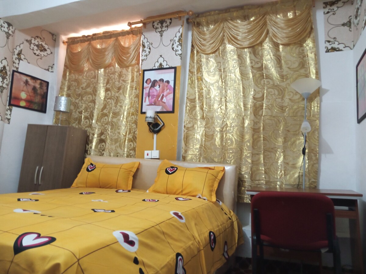 *Gated 2-Bedroom Apartment on the ground floor of two floor storey building *Fully Furnished *Clean, quite and peaceful environment *High level Security *Professionally Decorated Rooms *Furnitures in both rooms and living room and Dining Area *King & Queen Size Beds *TV with Satlite Channels *Air-condition *Stand alone and wall in wardrobe *Iron, Fridge, Gas Stove, Micro wave etc. *Wifi * Beautiful picture frames *Romantic Room Set up * Expandable bunk bed capability *Elegant room carpet
