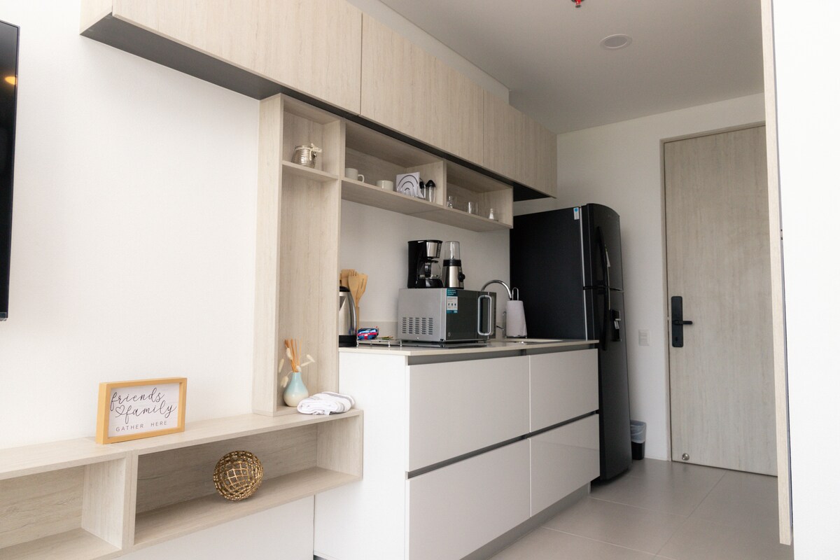 Los pisos altos y bajos estan sujetos a disponibilidad. NO SE PERMITEN VISITAS EN LOS APARTAMENTOS. Area 108m2. Cuenta con escritorio de trabajo con lámpara y silla de trabajo en cada habitación, caja fuerte por habitación, dos baños con amenities como shampoo, acondicionador, shower gel, papel higiénico, Toallas de cuerpo, manos y tapete para pies. Cocina totalmente equipada, zona de labores con lavadora, Tabla de planchar y plancha, balcón, sala, comedor y sofá cama.