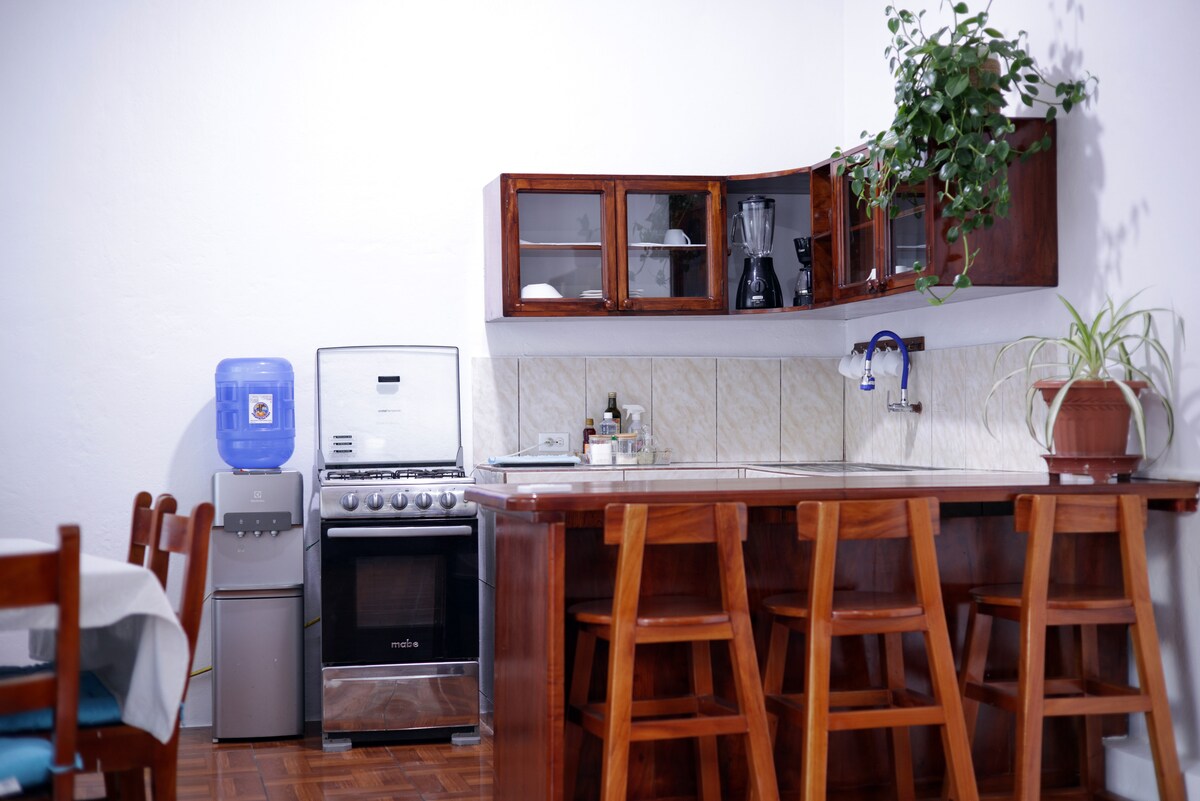Dispongo de una mini suit en un primer piso la habitación muy comoda bonita con un pequeño balconcito a la parte de atrás de la casa pero también se puede observar parte de las calles es muy intima perfecta para disfrutar o trabajar a 10 minutos del aereopuerto y de las playas cerca de todo