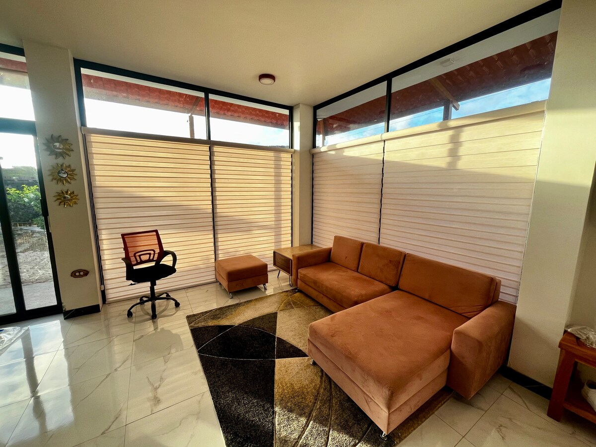 Ubicado vía Tortuga Bay, el apartamento te ofrece un espacio tranquilo y seguro para disfrutar de tu viaje en Puerto Ayora - Galápagos. A tan solo 5 min del acceso a la playa Tortuga Bay y 4 min del barrio central, cuentas con la mejor ubicación para movilizarte caminando al malecón y sitios turísticos. Capacidad máxima para 7 personas (dos camas matrimoniales, dos individuales y un sofá cama delicioso). Incluye internet Starlink!