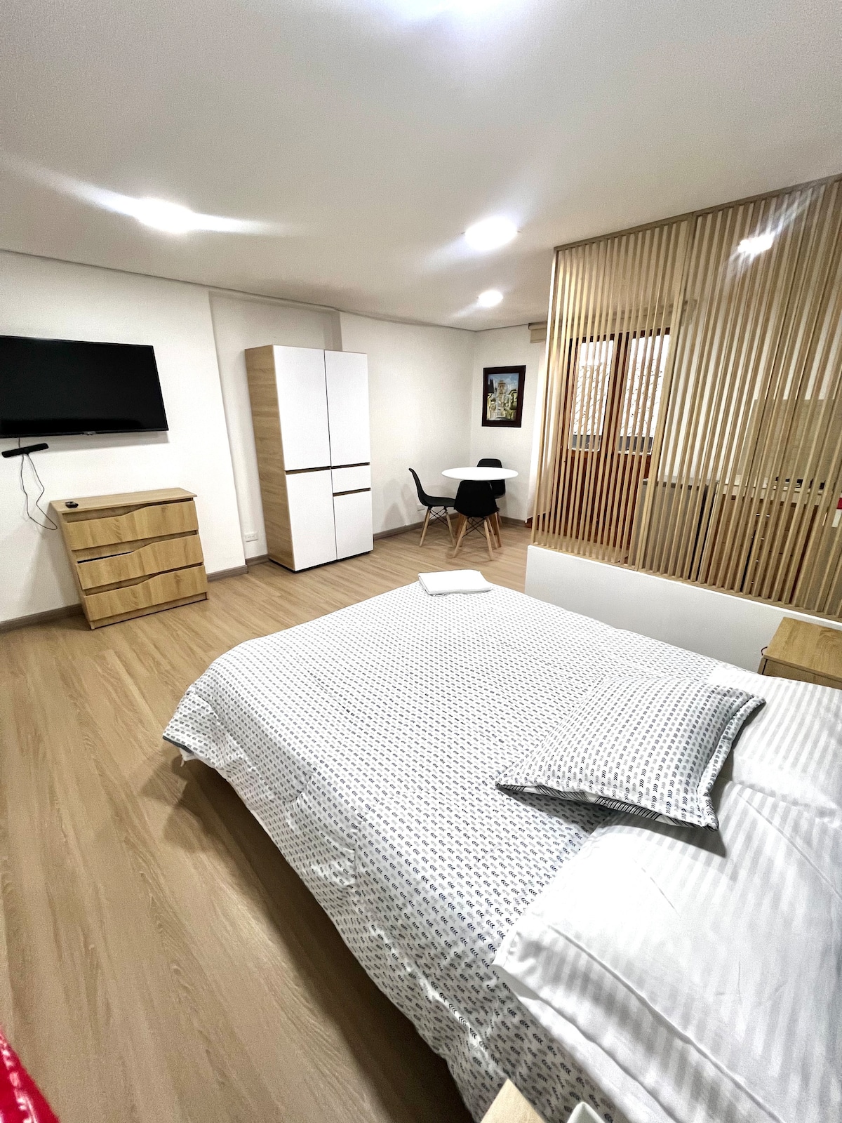 Enjoy comfort and modern style in this duplex studio! The first floor features a spacious living area, dining space, open kitchen, sofa bed, laundry area, and half bath. Upstairs, the master bedroom includes a double bed, trundle bed, walk-in closet, and private bathroom. We offer fast Wi-Fi, Smart TV, and electronic security for your peace of mind. Perfect for a comfortable and relaxing stay. Book now for a unique experience!