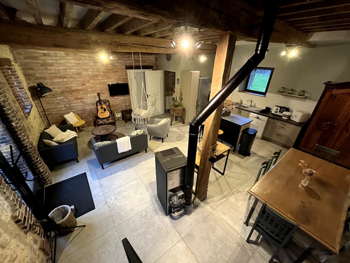 Notre chaumiere de 80 m2 avec vue sur l Eure, se compose : - d une pièce de vie avec cuisine ouverte et bar - d une SDB avec douche, WC, meuble vasque - d'une chambre avec un lit double 160x200. - de 2 lits 90x190 dans l alcôve ouverte sur la pièce de vie en face de la salle de bain. Chaise haute, lit bébé et prêt de vélos possible. À 1h10 de Montparnase, gare Vilette Saint Prest. Commerces accessibles à pied. 4 pers max. Autre logement sur site : airbnb.com/h/chaumiere28bis