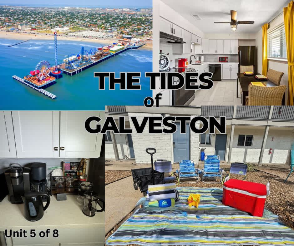 RELAXING, NEW BEACH HOME 1. mi Beach, SUNSET patio bay views, salty ocean breeze's, 6 free parking, pellet grill, playroom, dining space & outdoor shower. Families Welcomed, gated, covered patio & gated backyard, GARAGE-PLAY-ALL-DAY PLAYROOM- Pop-a-shot, corn hole, ping-pong, Pellet Grill, Covered Patio, ground floor shower. BEACH less than 5 Minutes to the Island's best attraction's, Seawall Blvd Restaurants, Bars, Pleasure Pier, Moody Garden's Golf Course, Fishing Pier, coffee cafe.