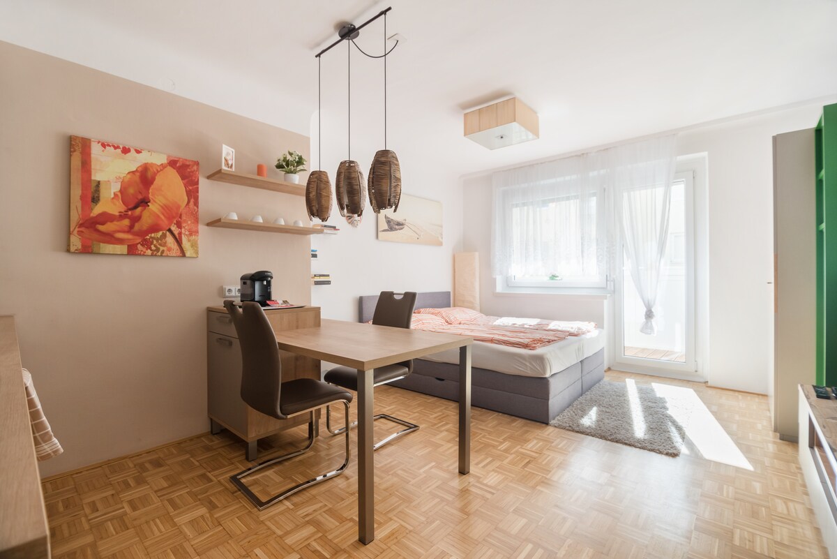 Müasir şəhər studiyamız mərkəzdən bir neçə dəqiqəlik məsafədə ən ağıllı yaşayış layihələrindən birində yerləşir. Messe Wien, WU və Prater qapınızın ağzındadır. Faktlar və xüsusiyyətlər: • 32 m² ağıllı ev • sadə nəqliyyat girişi • 360° mənzərəli şərikli dam terrası • 2017-ci ildə inşa edilmiş yeni şəhər layihəsi • peşəkar şəkildə idarə olunur