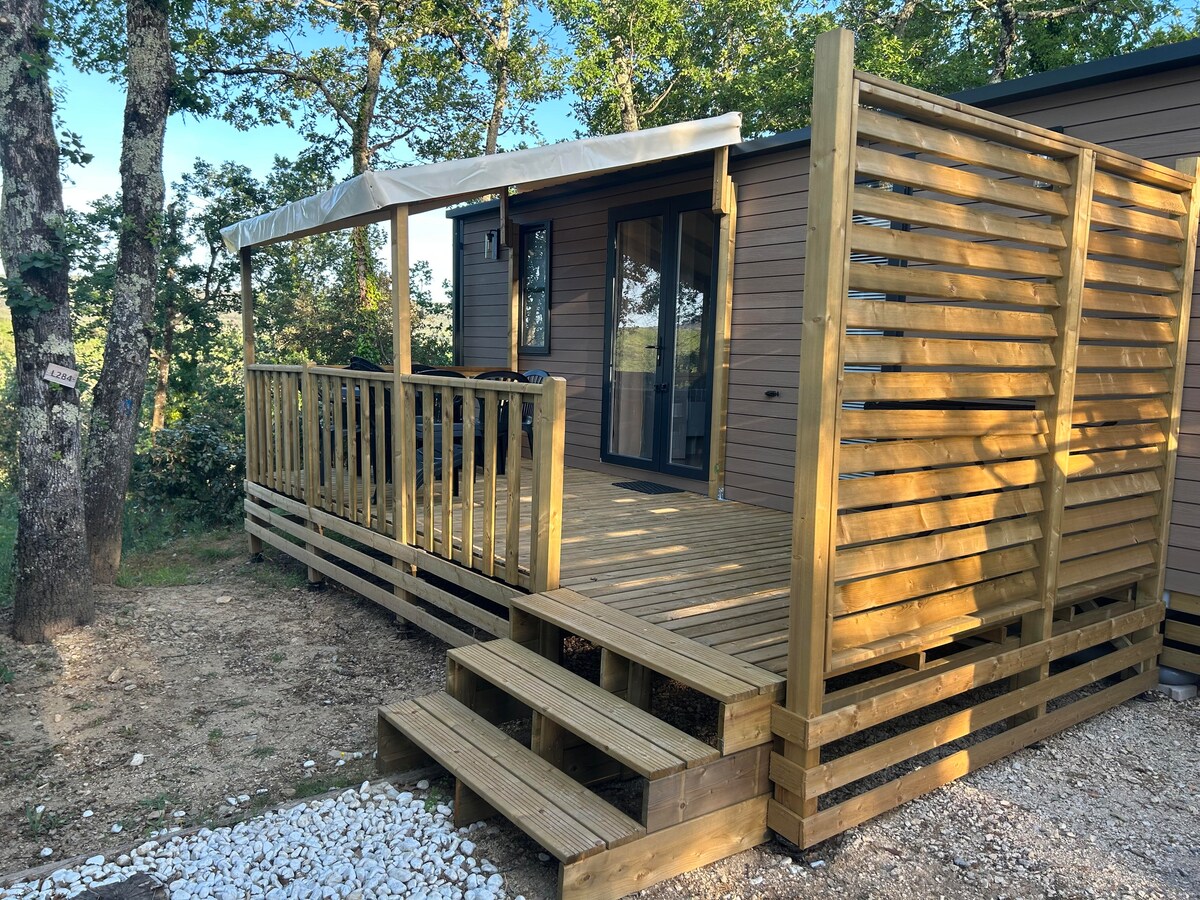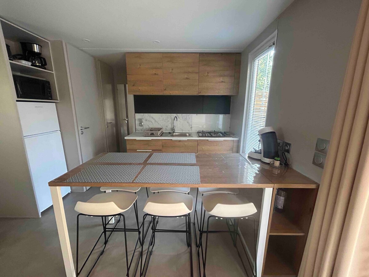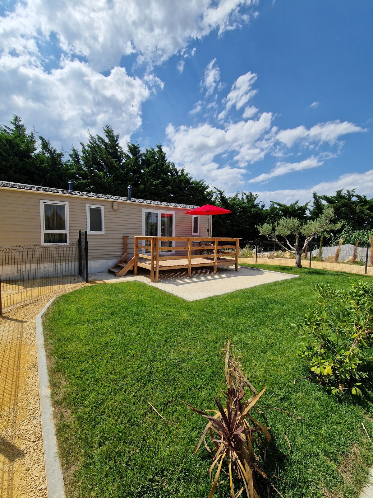 Grand mobile home neuf de 2025, avec wifi, capacité 6 personnes (une chambre parentale, deux chambres avec chacune 2 lits simples), deux salles de bain et 2 wc. Un grand canapé velours marine très confortable vous accueille, un espace repas à l'intérieur et un autre sur la terrasse couverte vous permet d'être dedans/dehors et de profiter de tout l'espace au calme. Les équipements sont de qualité, dans des tons neutres et élégants, avec en prime un superbe jardin paysagé et 2 places de parking.