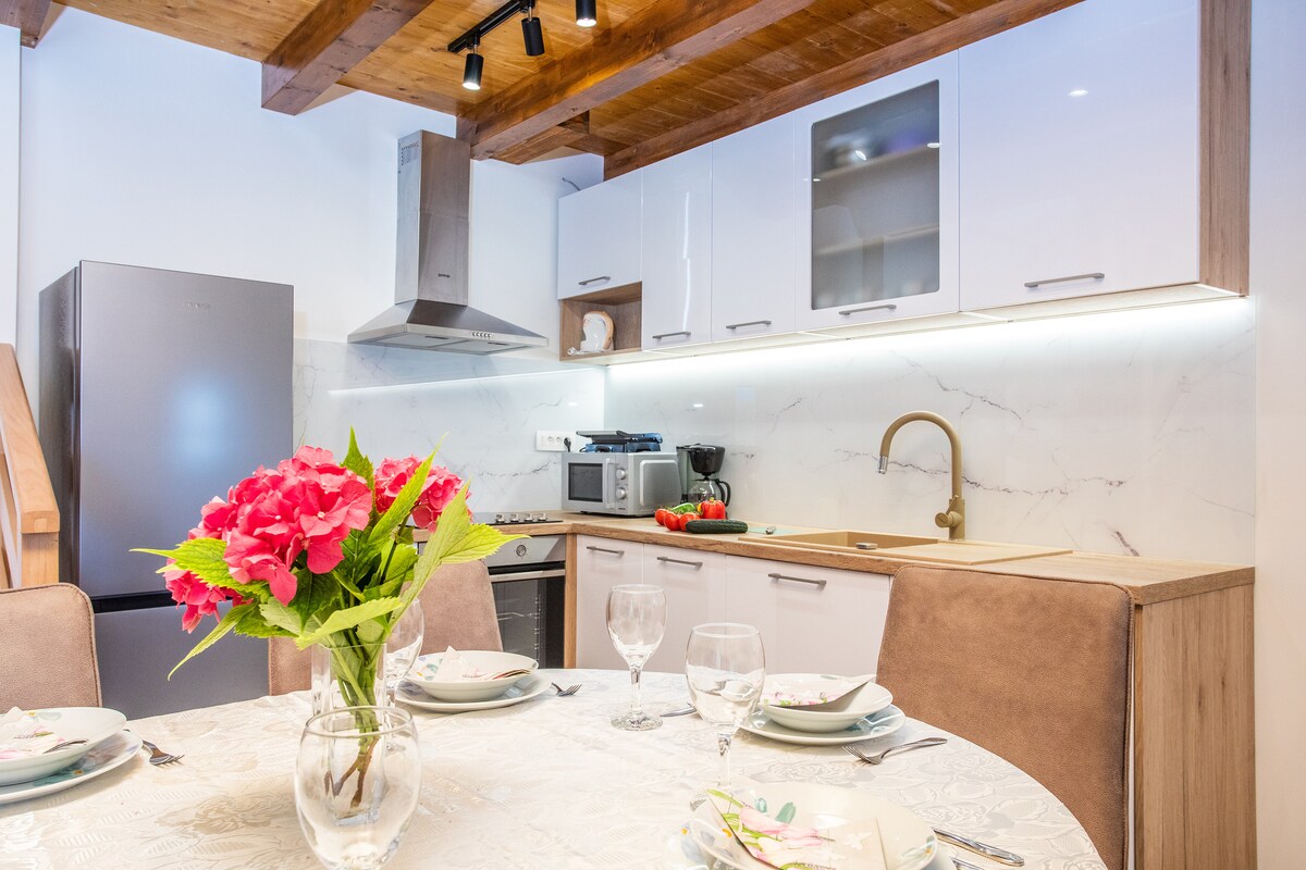 Brand new, fully equipped apartment with three cozy bedrooms and two modern bathrooms. Fully covered with AC units with fully equipped kitchen next to the dining area for up to 8 persons. Pool area offer a lot of space for your enjoyment, does not matter if you want to enjoy the sun or you need shady area just to chill next to the pool or jacuzzi. Newest addition- kid's playground area next to the pool and from this season pool is heated (15. 04. - 01. 11. depending on the current weather)
