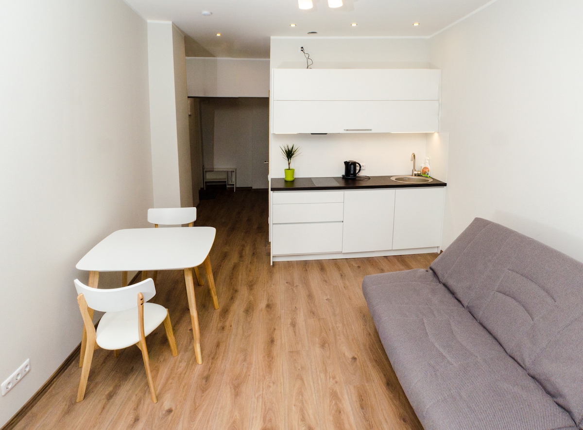 Yay mövsümündə səhər qəhvəsi üçün kiçik ayrıca terrasdan çıxış ilə sadə və funksional dizaynın əks olunduğu Riqa şəhər mərkəzində rahat və yığcam studiya mənzili. Yaşayış binası sakit bir yerdə yerləşən yeni layihədir. İçəri Şəhərə cəmi 10-15 dəqiqə çəkən ictimai nəqliyyata çox yaxındır. 10 dəqiqəlik piyada məsafəsində həm Vekyeari çimərlik qatarının, həm də Siqulda şəhər qatarının yola düşdüyü Domina ticarət mərkəzi və dəmiryolu stansiyası var.