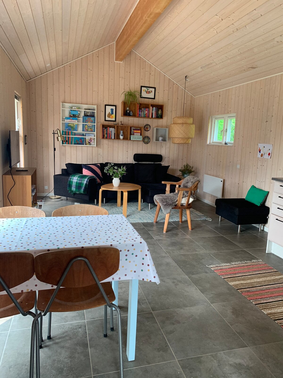 Kiçik taxta evimizi təmir olunmamış tikinti materialları ilə təmir etdik, onu miras və uçaq tapıntıları ilə bəzədik və artıq qonaq qəbul etməyə hazırıq. Ev təbiətə, meşəyə, yaxşı çimərliklərə, orta əsr şəhərlərinə, Fuglsang İncəsənət Muzeyinə yaxın və səs-küydən uzaq - bizim bildirçin və hər zaman çölə çıxa biləcək sərbəst ipək xınalarımız istisna olmaqla, bağımızda yerləşir. Ev 24 kvadratmetrdir və dörd nəfərlik kifayət qədər çarpayısı olan loftu da var.