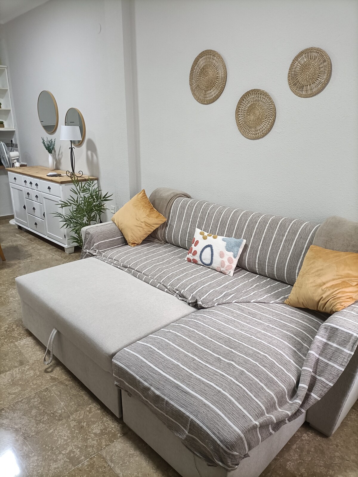 150 sm çarpayı olan iki nəfərlik yataq otağı və iki ədəd 90 sm tək çarpayı olan uşaq yataq otağından ibarət təmir edilmiş mənzil, balaca mətbəxi olan qonaq otağı və duşu olan hamam otağı. Gelvesdə yerləşir, avtobus dayanacağı 4 dəq. Metro 10 dəqiqəlik məsafədədir, Sevilya şəhərinin mərkəzi 20 dəqiqəlik məsafədədir, supermarketlər və banklar qapının yanındadır. Küçədə asan parkinq. Sakit bir kənddir və çox şey etmək lazım deyil, nəqliyyat vasitəsinin olması tövsiyə edilir, ictimai nəqliyyat çox yaxşı deyil.