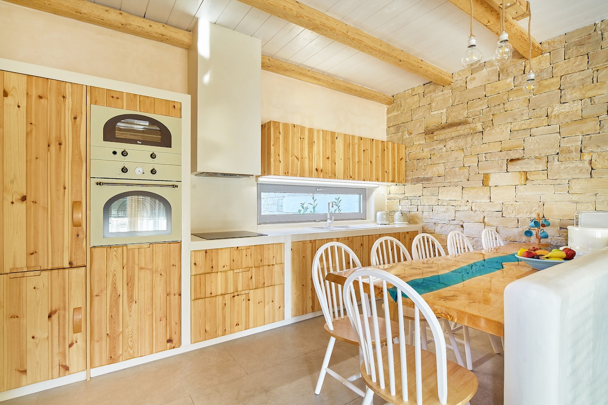 Üç qədim yunan qrottosunun üstündə tikilmiş tam təmirli, daşdan tikilmiş kompozisiya. Venesiya zeytun mətbuat fabriki kimi istifadə olunurdu. İndi iki hovuzu (qapalı və açıq) və orqanik tərəvəz və yerli meyvə bağı olan müasir tətil evi