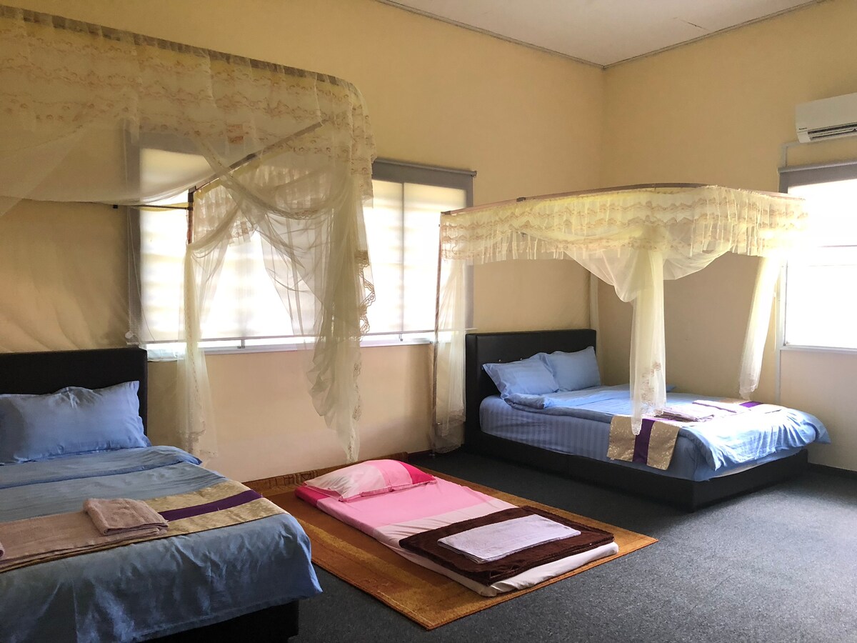 [yataq və səhər yeməyi] Kuanq çayının kənarında 2 akrlıq bağda yerləşən Malayziya ənənəvi ruhlu taxta kabinə. Səyahətçilər müasir həyatın səs-küyündən uzaqda sakit mühitdən zövq ala bilər. Evdə yetişdirilmiş vegilər mövcud ola bilər (şəraitdən asılı olaraq) və pulsuz çeşiddə toyuqlar arxa həyətdə sevinclə qaça bilər.