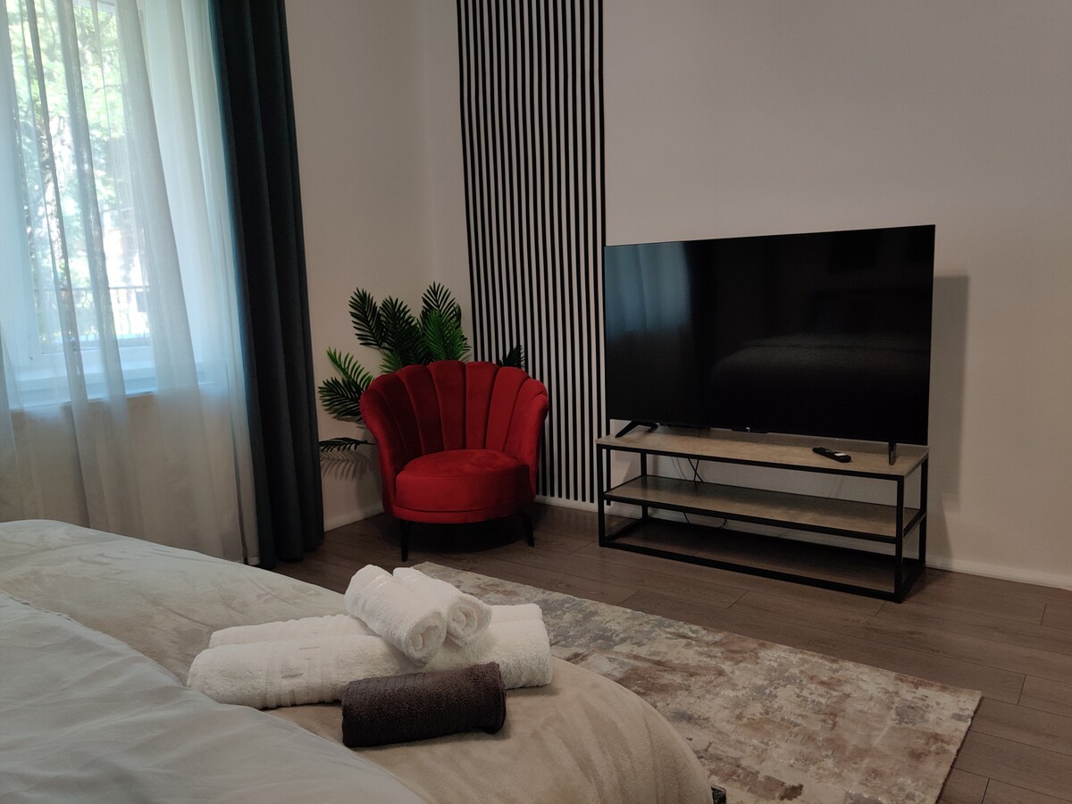 Apartament modern și primitor, perfect pentru un sejur confortabil. Dispune de un dormitor cu pat king-size, spațiu luminos și complet utilat: aparat de cafea, cuptor cu microunde și toate facilitățile necesare. Situat la doar 800 m de aeroport, oferă acces rapid și comod. Parcarea privată asigură liniște și siguranță. Ideal pentru relaxare sau călătorii de afaceri.