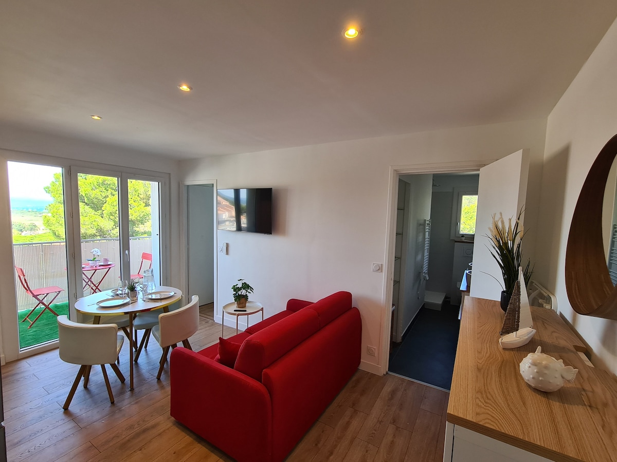 Dəniz və liman mənzərəsi təklif edən terraslı yeni rahat studiya. Çox parlaq, 150-179 sm ölçülü çarpayı, bərpa olunan kondisioner, düz ekranlı əlaqəli televizor, internet, duş kabinəsi olan hamam otağı, təchiz edilmiş və təchiz olunmuş mətbəx, paltaryuyan maşın, bağ mebeli olan balkon/terras... Təhlükəsiz yaşayış yerində lifti olan 1-ci mərtəbədə yerləşir. 50 m məsafədə böyük pulsuz ictimai parkinq yeri. Çimərlik 300 metr məsafədə Piyada olan bütün mağaza və xidmətlər (restoranlar, barlar, çörək zavodları, rahatlıq mağazası, həkimlər, aptek...)