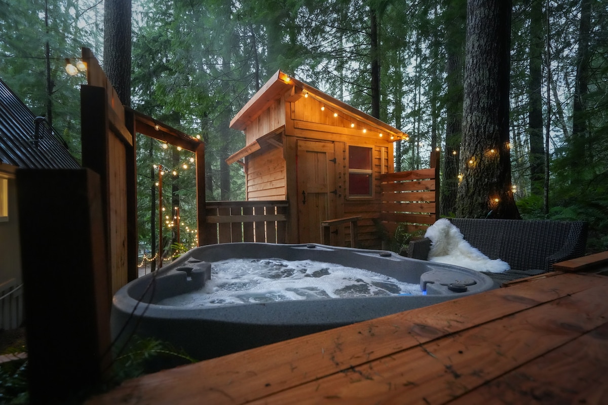 Private. Peaceful. Romantic. Designed for unforgettable getaways. Escape to your own secluded spa cabin just minutes from Mount Rainier NP. After a day of adventure, return to your private hot tub, custom cedar sauna, and fire pit beneath the forest canopy. Thoughtful details, cozy lighting, a fully stocked kitchen, coffee bar, games, and streaming make it easy to settle in and stay awhile. Many guests return year after year for anniversaries, birthdays, and quiet resets!