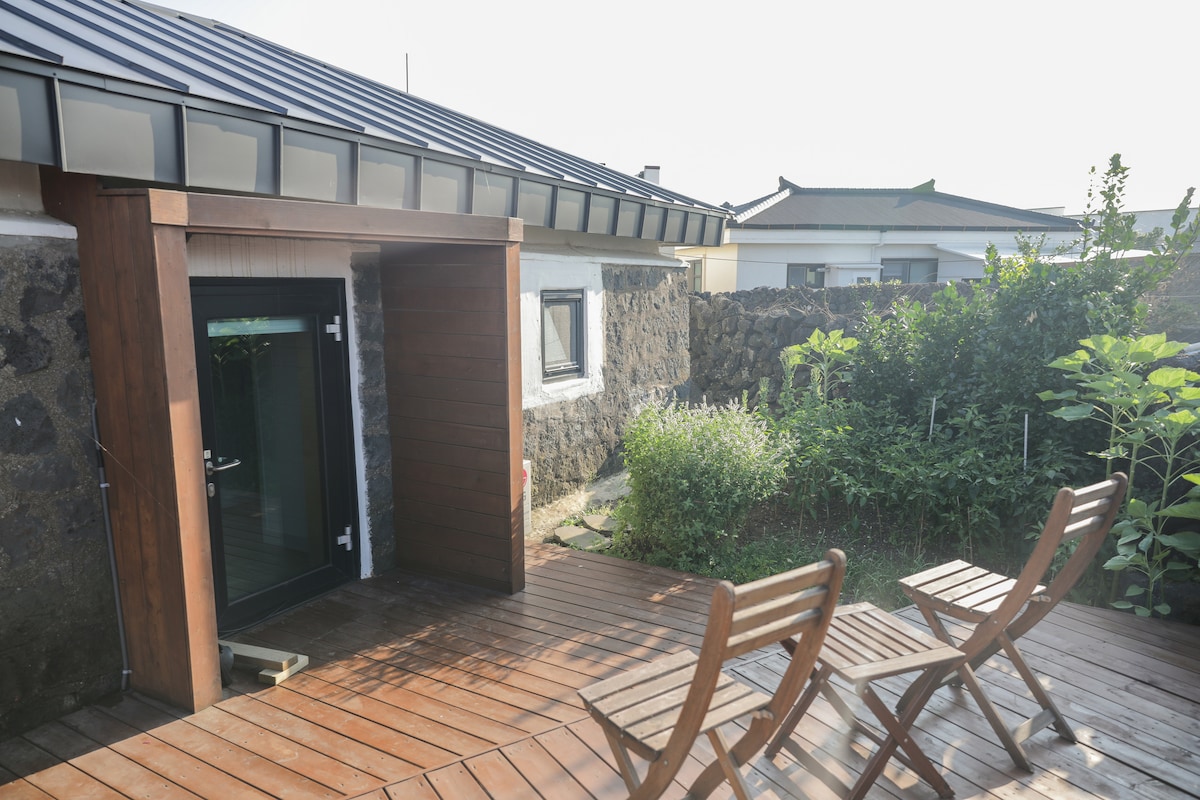제주시 동쪽 조천읍 신촌리 바닷가 마을내에 위치하며, 100년이 넘는 제주구옥 옛날 기와지붕과 돌집을 그대로 유지하고 내부는 현대적으로 목수인 호스트가 직접 올 수리했습니다. 안쪽의 작은 마당에는 오래전부터 심어져있는 감나무와 숙소 내부에서 별도의 문으로 나가면 마당과 툇마루가 연결되어있습니다. 원룸 형태의 작은 공간이 아늑함을 줄것입니다. 숙소는 호스트가 거주하는 건물의 뒷편에 위치해 프라이빗하게 한팀만 이용할수 있습니다.