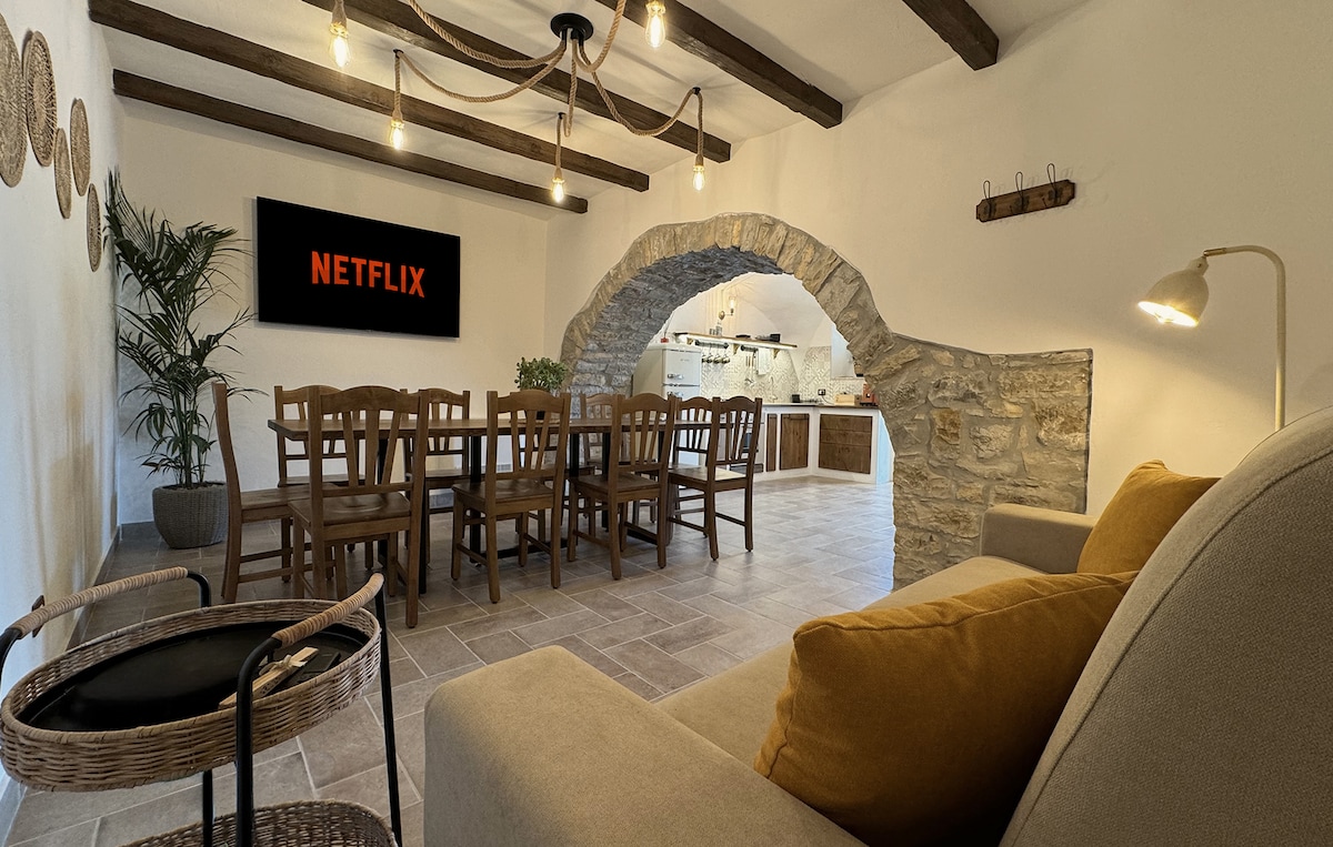 Termolinin tarixi mərkəzində yerləşən ev. İçərisində duşu və paltaryuyan maşını olan kiçik bir hamam otağı var. Rahat ikinəfərlik çarpayı, şkaf, böyük qarderob və Netflix ilə Smart TV olan yataq otağı! Girişdə mətbəx bütün qab-qacaqlar, minibar və yalnız səhər yeməyi üçün ayrılmış, kapsullu qəhvə maşını, şirəçəkən və çay üçün çaydanı olan bir hissə ilə təchiz olunub.