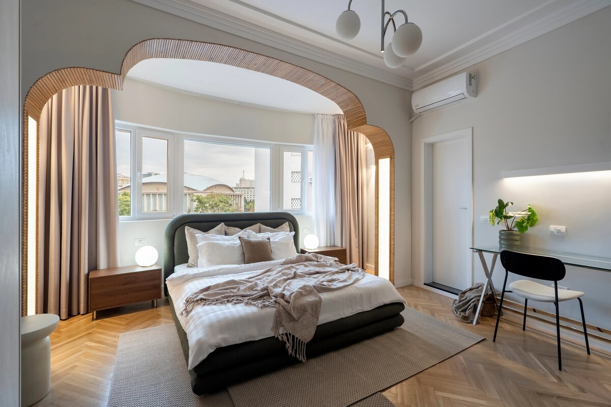 Experience panoramic views of Sala Palatului and the Royal Palace from this elegant 3BR apartment in the heart of Bucharest. Located just steps from Calea Victoriei, this bright home features three king bedrooms with plush bedding, two modern bathrooms, and spacious living areas. Enjoy stunning balcony views, a fully equipped kitchen, air conditioning in every room, fast WiFi, smart TVs, and a washer. Perfect for both families and groups seeking comfort and style in a prime central location.