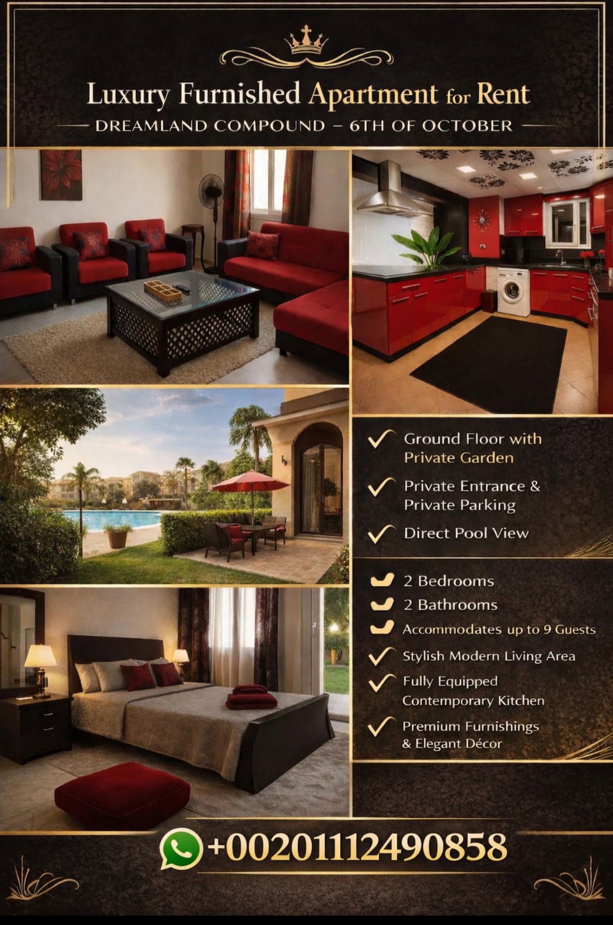 Misirdəki dreamland kurort kompleksində mükəmməl qonaqlama üçün çoxlu çarpayıları olan bu möhtəşəm məkana bütün ailəni və dostlarınızı gətirin Yaxınlıqda klassik,günəşli və rahat Giza piramidaları və sfinx hava limanı Üzgüçülük hovuzuna və landşaftına baxan Security24/7 Balkon Hovuzdan düzünə ayrıca bağça xüsusi giriş Əsas imkanlar 2 dəq. uzaqlıqdadır (bazar-armacy-laundry-spa və çörək) Yaxınlıqdakı piyada 5 dəqiqə Misir Qolf meydançası Otellər Mall Bayraqlar merkezi Hiper market Pegasus Atçılıq mərkəzi