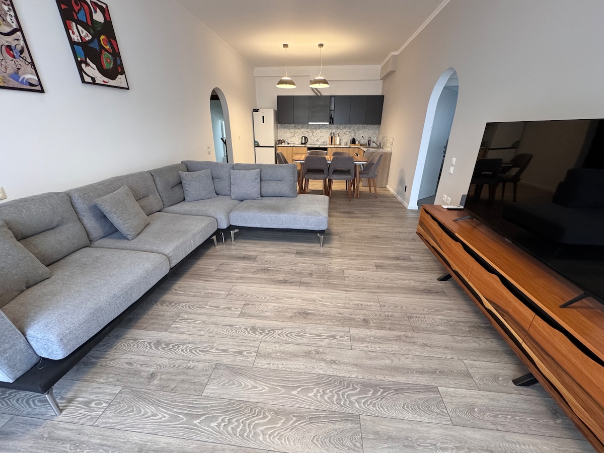 Müasir Dənizkənarı Mənzil – Baş Mövqe və Valehedici Görünüşlər Şəhər mərkəzindən cəmi 500 m, ictimai çimərlikdən 5 dəqiqə və sahildən 30 m məsafədə yeni mənzildə qonaqlayın. İki ayrıca eyvandan heyranedici dəniz və şəhər mənzərəsindən zövq alın. Məkana geniş qonaq otağı, tam təchiz olunmuş mətbəx, rahat yemək sahəsi, iki rahat yataq otağı və müasir hamam otağı daxildir. Rahat tətil və ya işgüzar səfər üçün mükəmməldir.