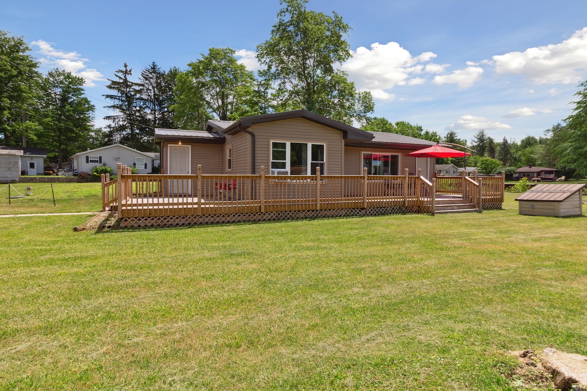 Located on a quiet tree lined road in the woods, and on a peaceful lot overlooking Grass Lake in Mid Michigan's Gladwin. This waterfront cabin is the perfect place to get away and enjoy "Pure Michigan" with all the comforts of home. The morning and evening views are phenomenal! Enjoy the quiet, secluded beauty and serenity of this property. The 900 square foot spacious home also boasts views from the massive 1500 square foot deck, a built in gazebo, and a three season porch with seating.