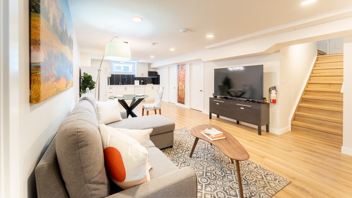 Geniş 2 otaqlı Süita | 1100 Kvadrat metr | Sürətli Wi-Fi | Baş Mövqe Qonaqpərvər müasir atmosferi olan zirzəmi bloku. Heritage Park, Stampede Park və Heritage C-Train stansiyasından cəmi bir neçə dəqiqəlik məsafədə yerləşən ən yaxşı turistik yerlərə asanlıqla giriş əldə edəcəksiniz. Ev özünüzü evdəki kimi hiss etməyiniz üçün məişət texnikası və əsas ehtiyaclarla təchiz olunub. Xüsusi giriş, öz-özünə giriş, Süita təmizdir və sizin üçün hazırdır. Məhəllə sakit, ev isə sakitdir. Wi-Fi, Ağıllı TV mövcuddur.