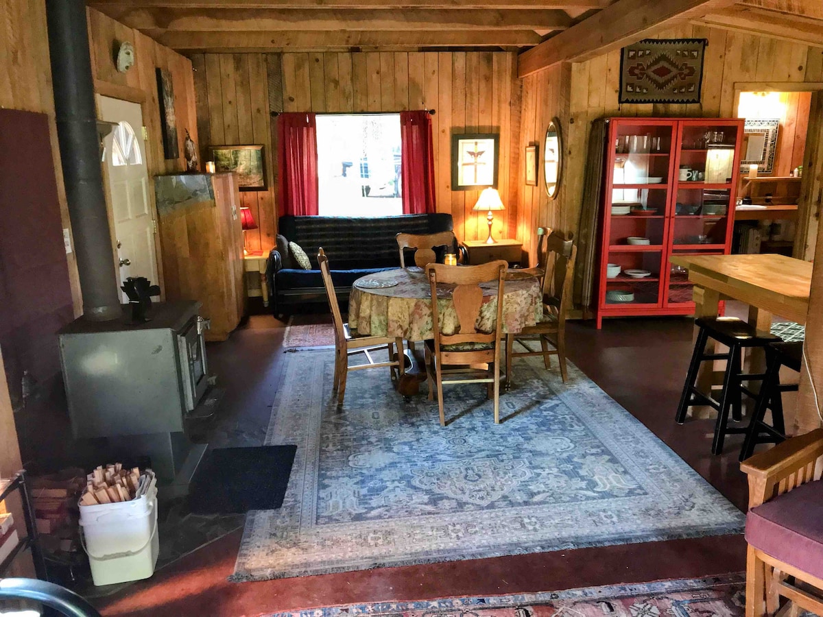 1920-ci illərə aid kabinamız Ağ Salmon çayı boyunca meşədə yerləşir. Maksimum 4 nəfər yerləşə bilər. Yataq düzülüşü ilə bağlı təfərrüatları oxumağı unutmayın. Biz 1 və ya 2 yetkin cütlük üçün ən yaxşı seçimik (hər yataq otağında bir queen ölçülü çarpayı və bir tam ölçülü çarpayı yuxarı mərtəbədə, bir tam ölçülü divan isə aşağı mərtəbədədir). 1-2 uşaqlı cütlük də asanlıqla işləyə bilər. Ayrı-ayrılıqda yatmalı olan 4 böyük üçün bu məkan uyğun deyil, çünki onlardan ikisi eyni çarpayıda yatmalı olacaq. Əvvəlcədən xəbərdarlıq verildiyi halda yaxşı tərbiyəli itlərlə birlikdə gələ bilərsiniz.