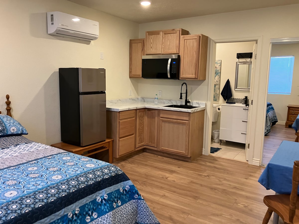 Kick back and relax in this calm, stylish space. This suite offers the comfort of a home away from home. It has a queen bed, and a sleeper sofa. This suite has a full kitchen with coffee bar with amenities and a large bathroom with washer and dryer. She She's stylish suite is more than a studio - it's a curated space for modern living, bold creativity, and effortless style.