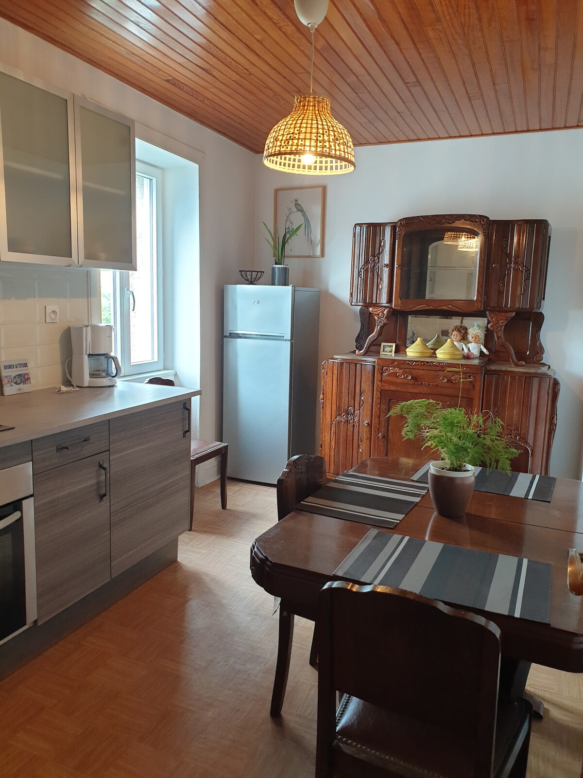 Rahat kabinə 2 üçün idealdır, 4 üçün mümkündür. - 2 nəfərlik divan çarpayısı olan qonaq otağı - Mezzanin ikinəfərlik çarpayısı. - 2 yanar induksiya kabeli, soyuducu, çaydan, qəhvə maşını və toster ilə mətbəx. - 4 nəfərlik yemək sahəsi. - Duş - Quru tualetlər - Döşəkağılar təmin edilir. - Velosiped sürən insanlar üçün və ya unutma halında dəsmallar təmin edirik... Wi-Fi - Odun sobası - Bağça, masa olan terras. Mövcuddur: oyunlar, kitablar və sənədlər. Pinq-ponq masası