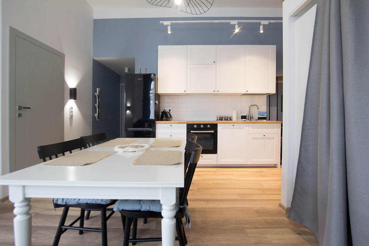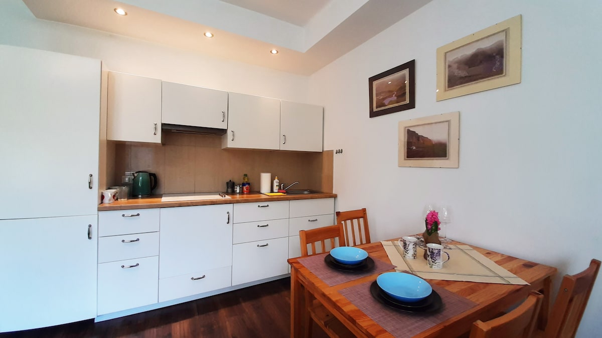 Apartament Radosny maksimum 4 nəfərlik balkonlu tam təchiz olunmuş mənzildir. Şəhər mərkəzində, hər şeyə yaxın ərazidə yerləşir. Bizə günün istənilən vaxtı gələ bilərsiniz, ingilis dilində danışırıq. Hər qonaq üçün bir şüşə su, otel başmaqları, hamam dəsmalı və bir sıra tualet ləvazimatları - sabun və duş geli hazırlayırıq. Mətbəx tam təchiz olunub. Mənzildə Wİ-Fİ, NETFLIX və TV kanallarına pulsuz giriş var. Ziyarətinizi səbirsizliklə gözləyirik.